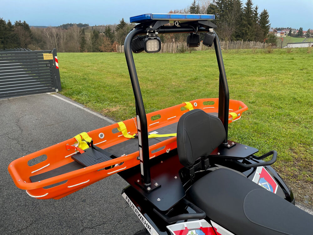 Halterungen für Schleifkorbtragen ermöglichen die schonende Rettung von Verletzten aus unwegsamem Gelände – dort, wo jedes andere Einsatzfahrzeug kapituliert.