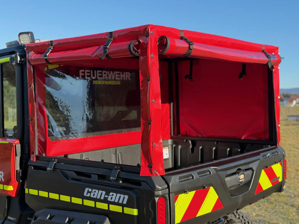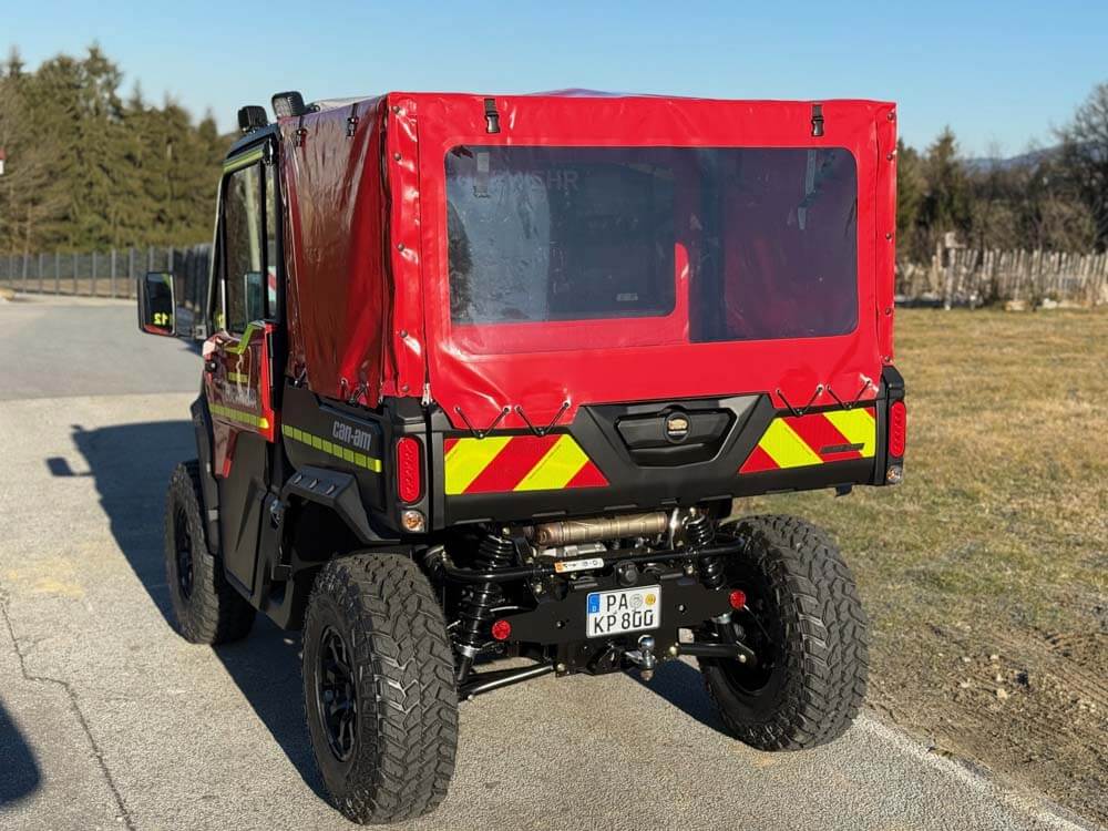 Der eigens entwickelte Planenaufbau für den Can-Am Traxter schützt Ausrüstung und Material zuverlässig vor Regen, Schlamm und Witterung – selbst bei anspruchsvollen Einsätzen. Dank der Öffnung an allen drei Seiten bleibt das Ladegut jederzeit schnell und flexibel erreichbar. Durch die leichte Bauweise wird die Nutzlast nur minimal beeinflusst – die Beladungsmöglichkeiten bleiben uneingeschränkt erhalten. Wetterfest. Praktisch. Einsatzklar – ohne Kompromisse.